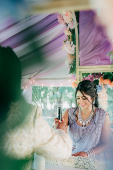 The first part of the day was steeped in Hindu tradition. Under a beautifully adorned stage, the bride and groom exchanged garlands in the Jaimala ceremony, symbolizing their acceptance of one another. The unity candle and heartfelt vows followed, filling the space with emotion and joy. After the ceremony, the couple posed for their first portraits as newlyweds, dressed in breathtaking traditional Indian attire. The bride’s lavender lehenga stood out beautifully, adding a soft, elegant touch to their post-ceremony glow.